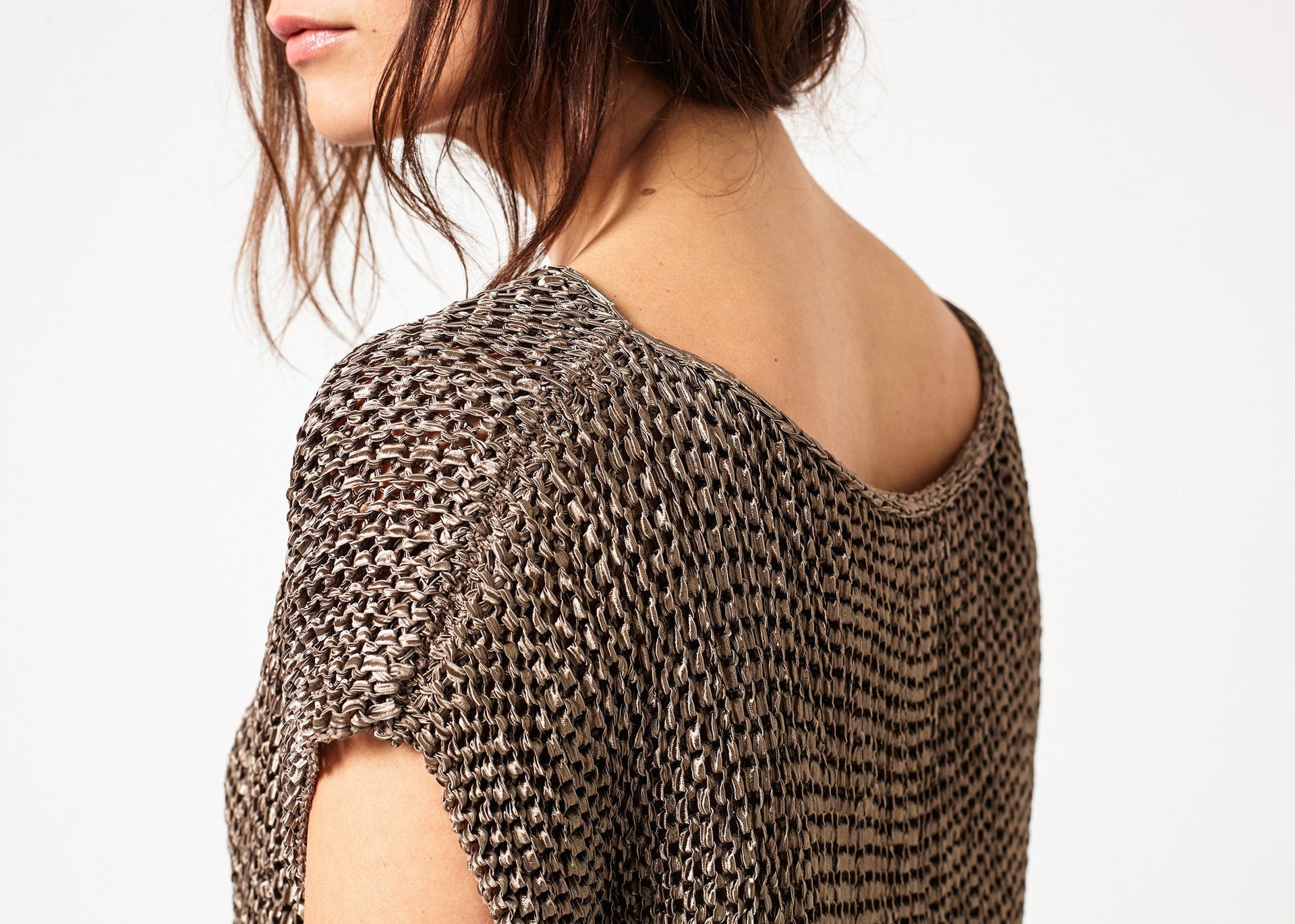 Graceful chainmail for the modern style warrior from Annette Gortz. Nearly sleeveless with a wide neckline. Straight fit through thigh. Color Mud. 76% Viscose, 24% Polyamide. Made in EU. Lana is wearing a Small.